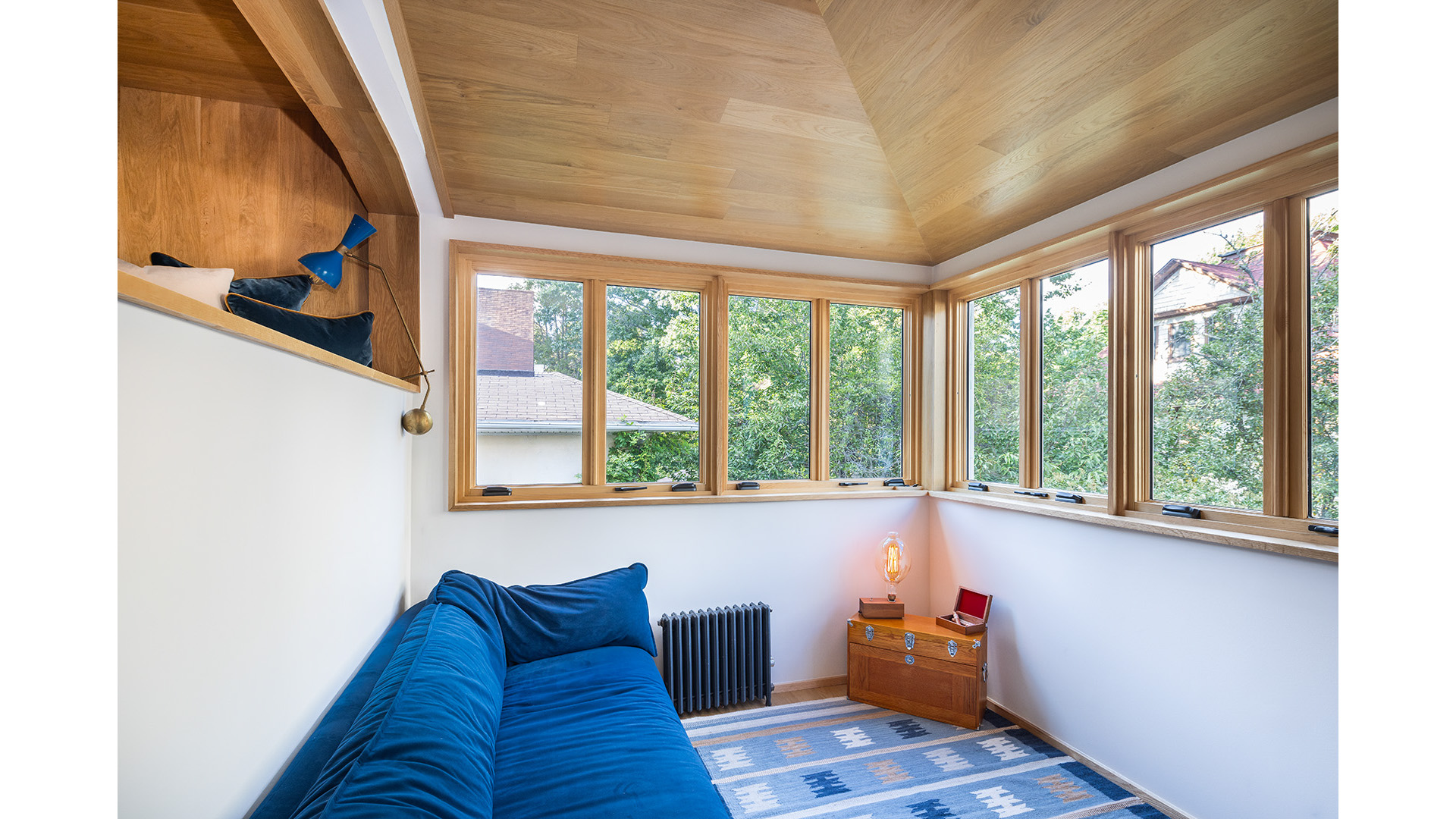 Originally, a powder room was located off the main stair landing, which protruded into part of the kitchen, and intersected the sunroom above. Removing the powder room allowed us to reconfigure the kitchen, making space for a new banquette in front of the existing leaded glass windows, a coffee bar, and ample cabinet space. This also freed up space in the sunroom adjacent to the primary bedroom. We reallocated part of the sunroom to serve as an en suite primary bathroom, and the remaining space became a secret den area accessed by a secondary staircase added in place of the old powder room, which the owners requested be concealed by a mirror door. This space was the only place in the house where contemporary finishes were used, with Scandinavian influences helping to create a warm, quiet retreat to nap or listen to music.