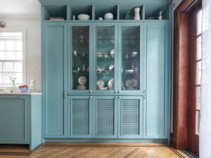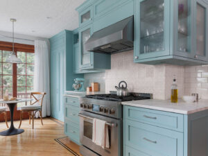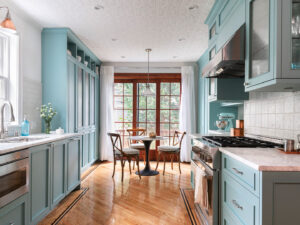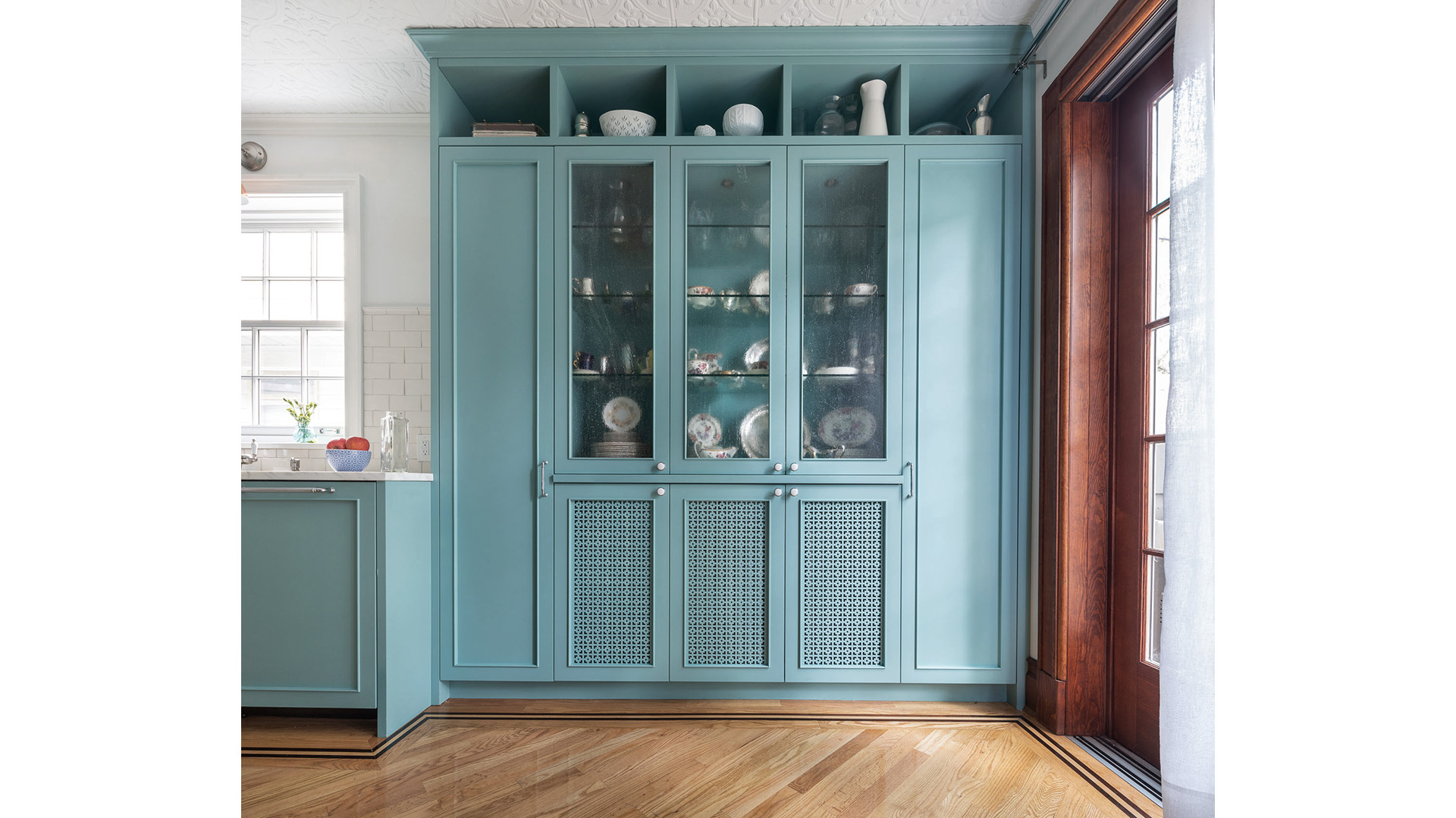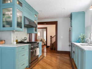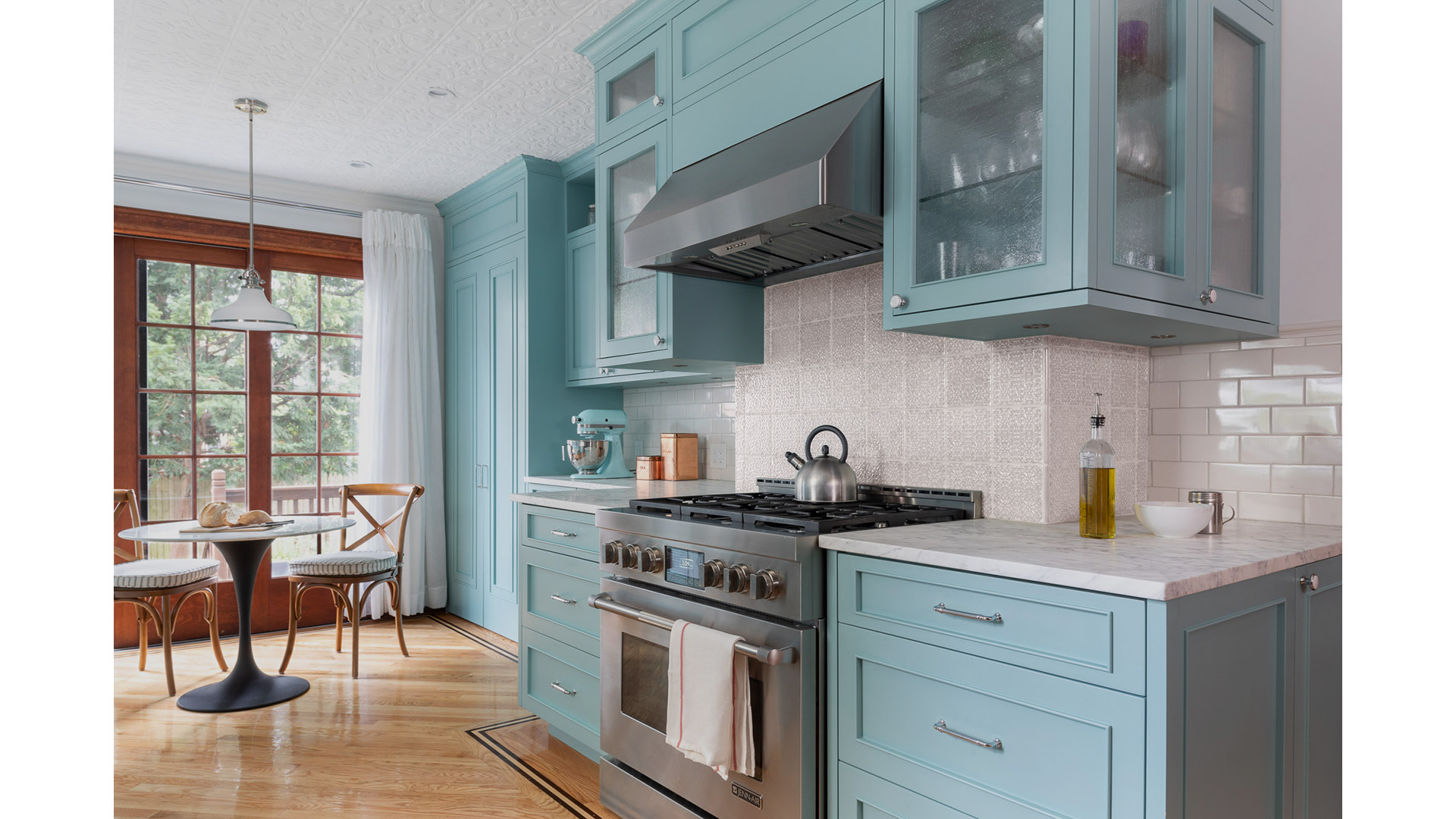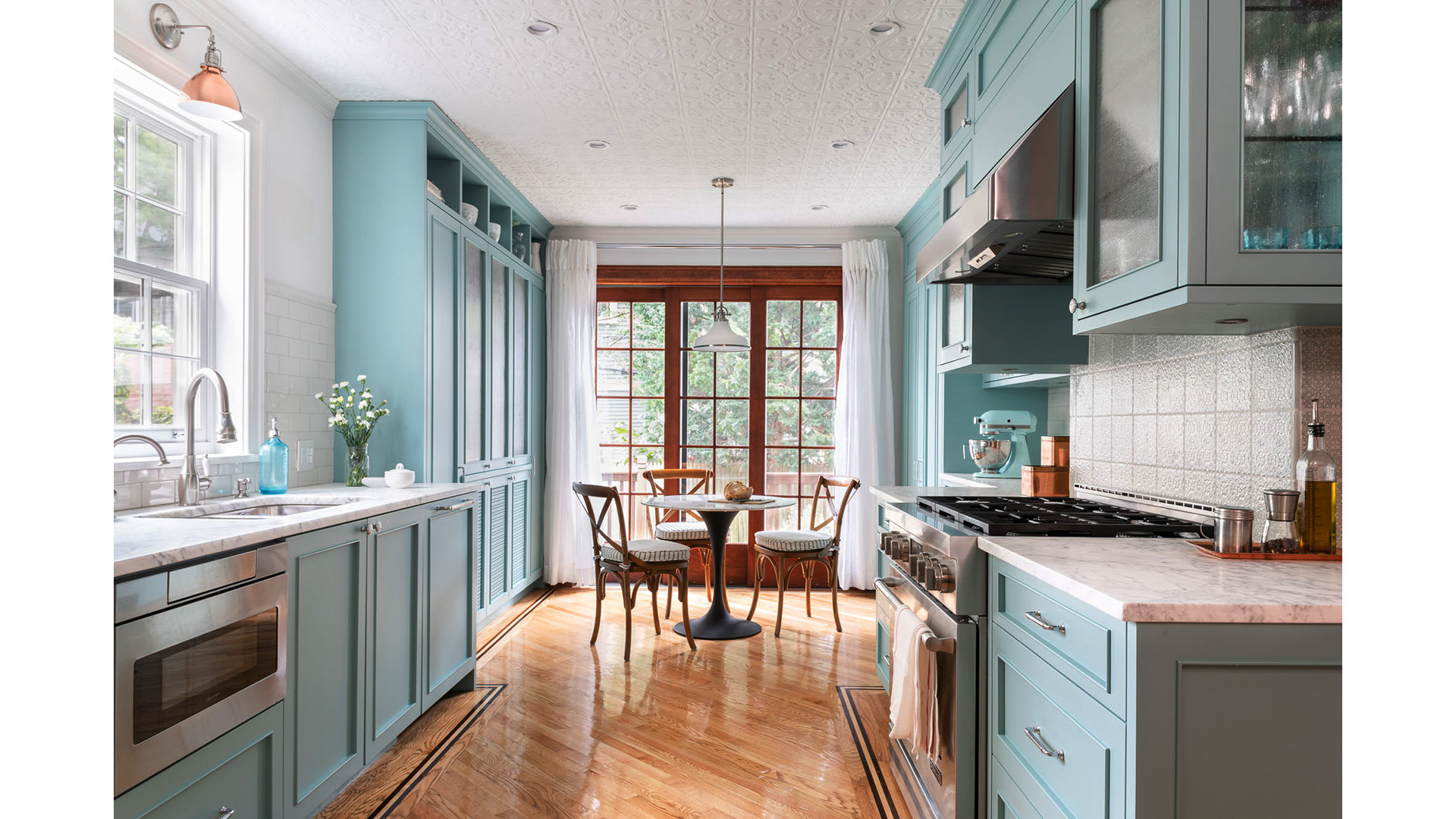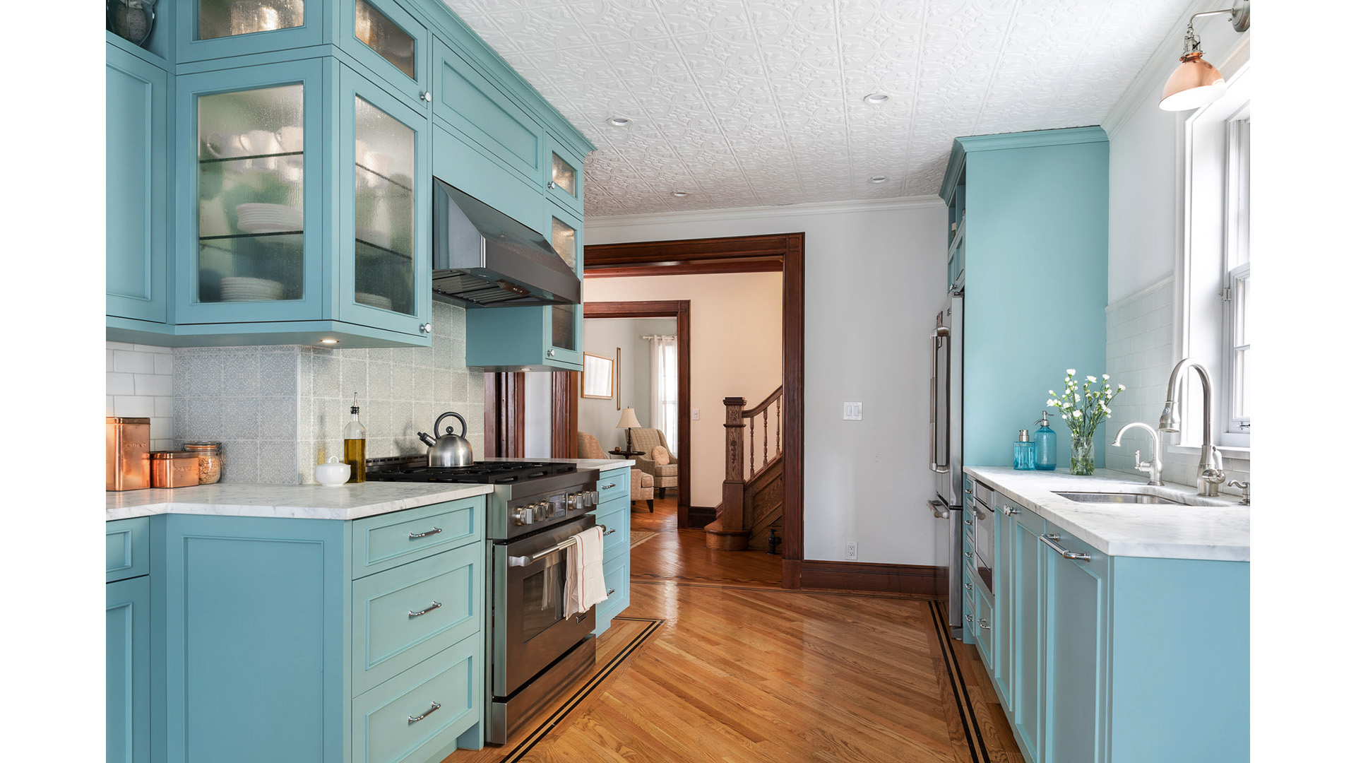 The property is located in the historic Kensington area, known for its detached wood frame homes built in Queen Anne and Dutch Colonial Revival styles. The owners were in need of a new kitchen and more daylight, but wanted to retain the property’s old world qualities. BHA set out to reconfigure part of the first floor striving to incorporate new functionality into the home’s historic character. The existing powder room needed to move, as it was opening up to the dining area and taking up a corner of the kitchen. An existing closet near the building’s entrance was removed to make room for a new powder room. At the kitchen rear two small windows were removed to create a much larger opening for a triple glass door, creating a sunny connection between the dining area and the rear patio. Existing radiator was relocated and became part of a new hutch, while the old location of the radiator was transformed into a spacious walk-in pantry. New counter space was added on both sides of the oven. Existing floor pattern and border were restored and reconfigured to fit the new layout, new tin ceilings installed to echo material choices of the Victorian era. New millwork was built in the entry area to match existing.