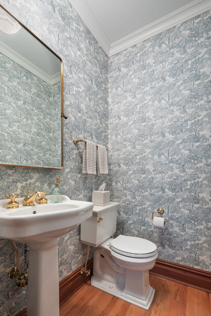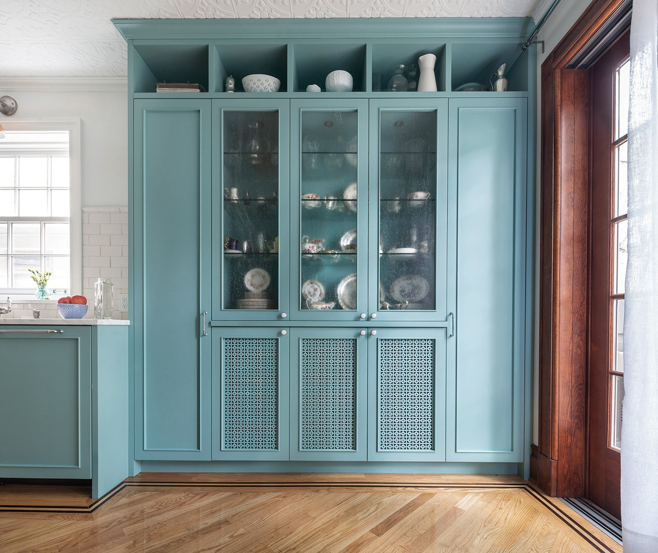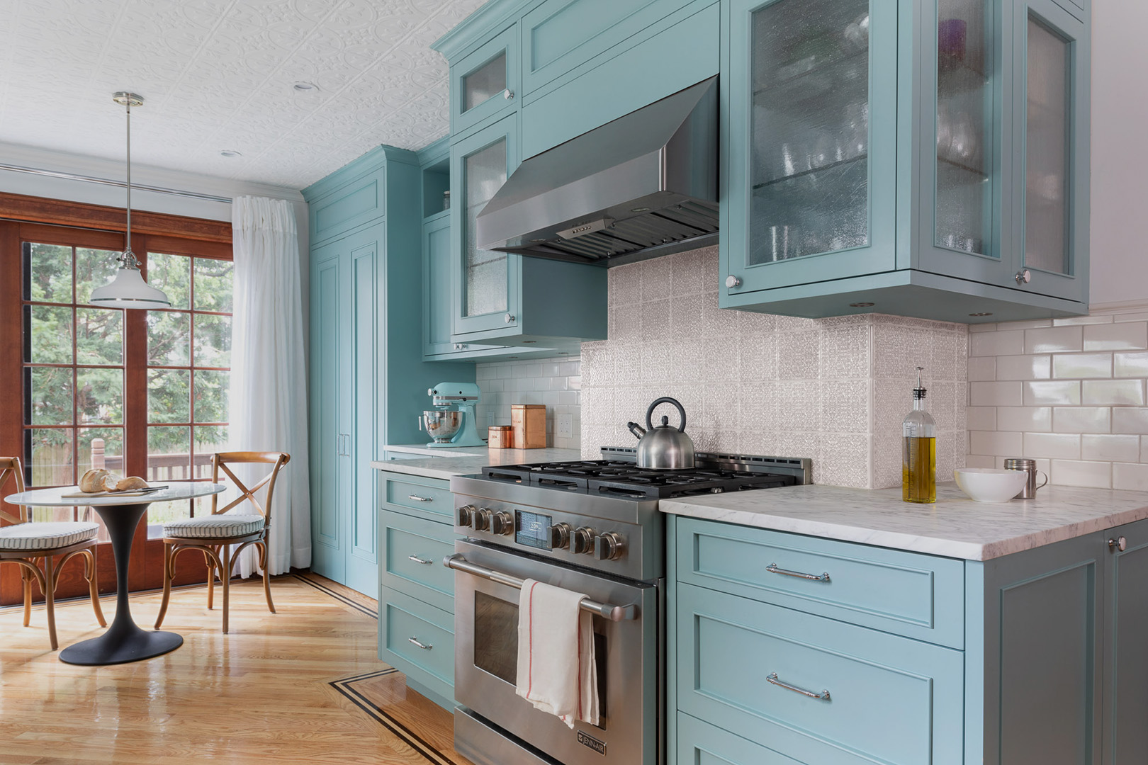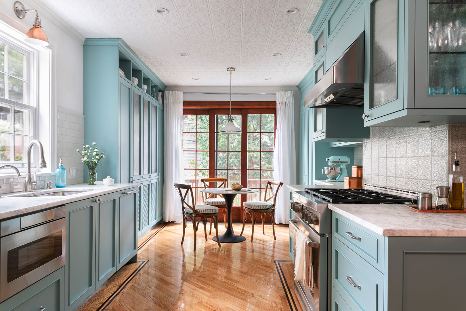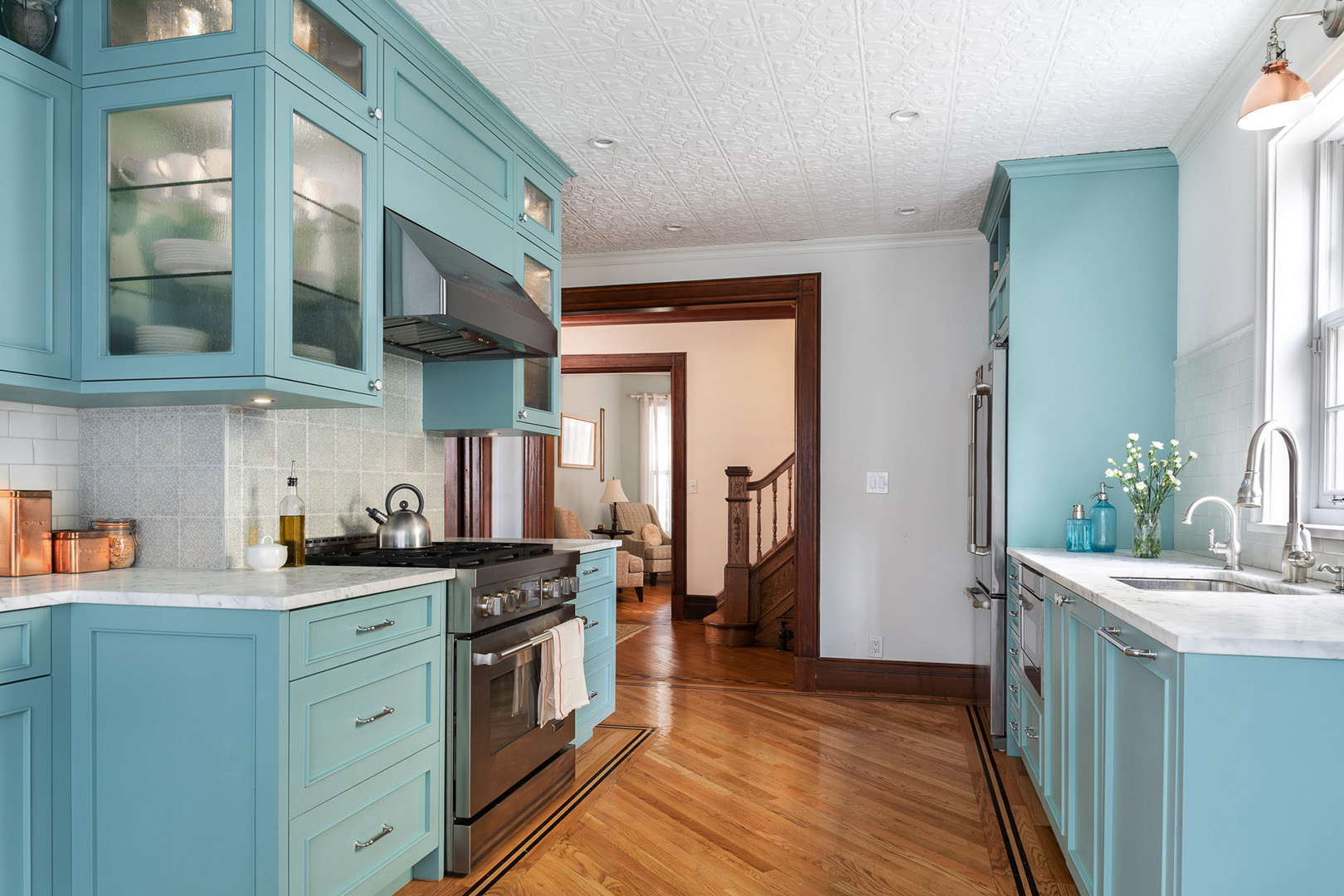 The property is located in the historic Kensington area, known for its detached wood frame homes built in Queen Anne and Dutch Colonial Revival styles. The owners were in need of a new kitchen and more daylight, but wanted to retain the property’s old world qualities. BHA set out to reconfigure part of the first floor striving to incorporate new functionality into the home’s historic character. The existing powder room needed to move, as it was opening up to the dining area and taking up a corner of the kitchen. An existing closet near the building’s entrance was removed to make room for a new powder room. At the kitchen rear two small windows were removed to create a much larger opening for a triple glass door, creating a sunny connection between the dining area and the rear patio. Existing radiator was relocated and became part of a new hutch, while the old location of the radiator was transformed into a spacious walk-in pantry. New counter space was added on both sides of the oven. Existing floor pattern and border were restored and reconfigured to fit the new layout, new tin ceilings installed to echo material choices of the Victorian era. New millwork was built in the entry area to match existing.